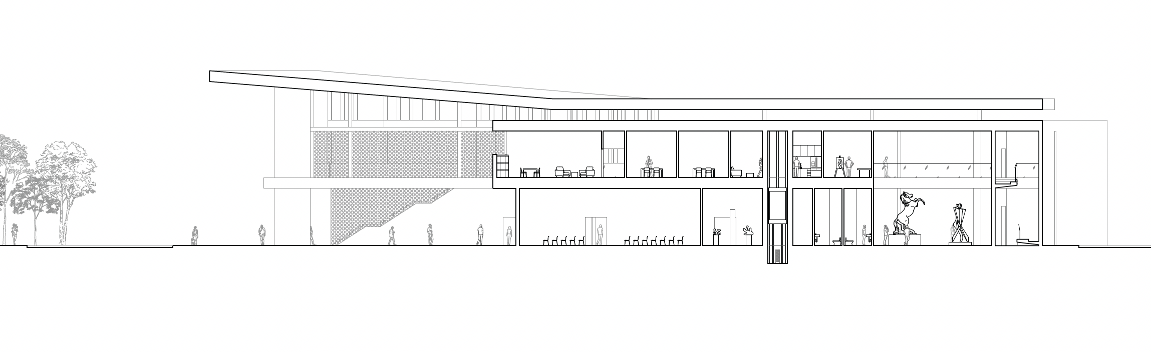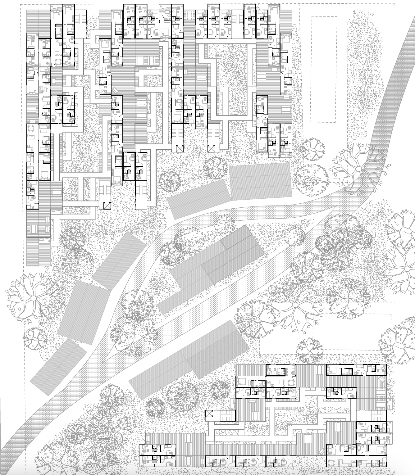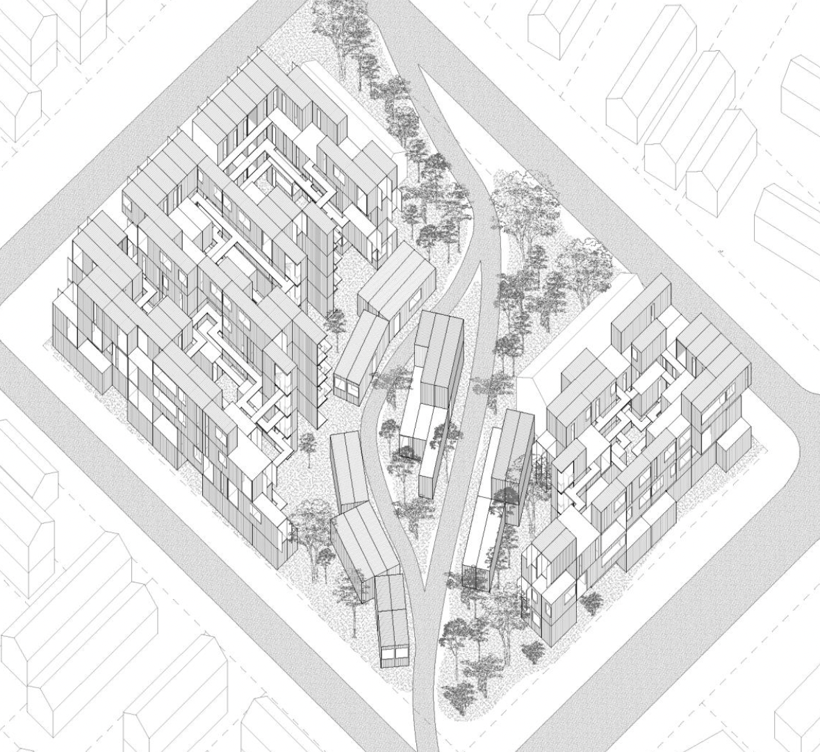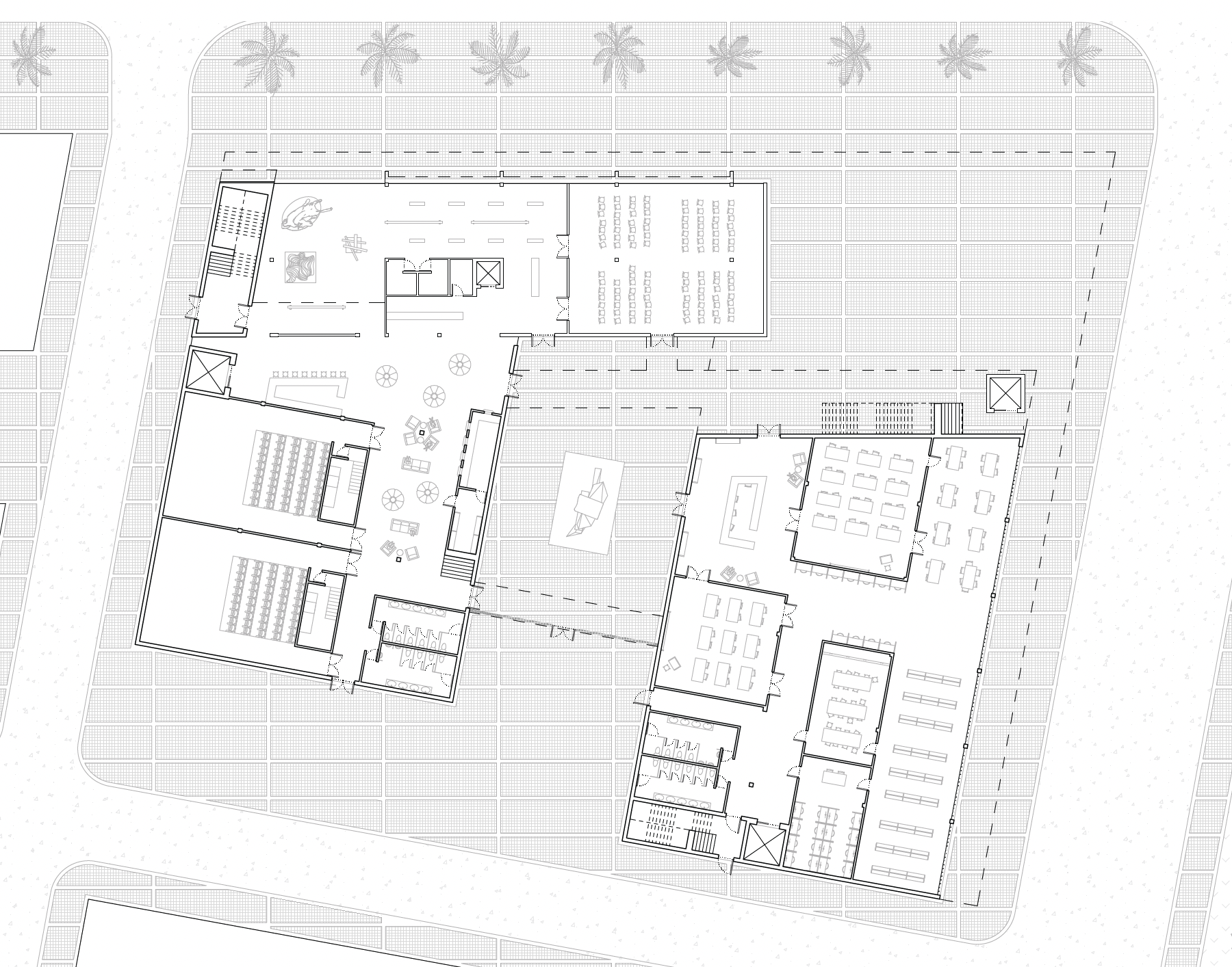 Third-year architectural and urban design studio project at Tulane School of Architecture. The cinema program served as a vehicle to engage urban site conditions, movement, and building form simultaneously, treating architecture and city as inseparable problems of design.